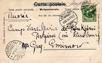 | K13.037: 06.08.1905 Ambulant 11.08.1905 Kaukjärvi Mr Greg. Smirnov Camp Sartillerie de Kaukjärvi Perkjärvi (via Petersbourg) | |