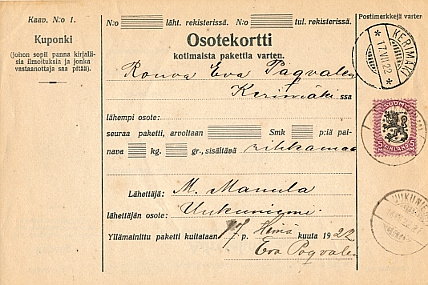 | K68.007: 16.07.1922 Uukuniemi 17.07.1922 Kerimäki Rouva Eva Paqvalen Kerimäki | |