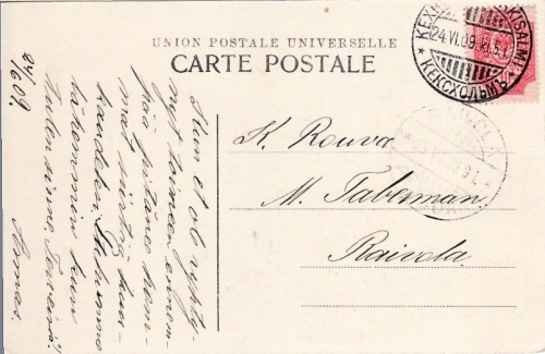 X704.02 Postikortti 24.06.1909 Käkisalmi 25.06.1909 Raivola M. Taberman (vh)