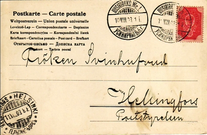 X677.02: Postikortti 10.08.1903 Uusikirkko Wp.L 11.08.1903 Helsinki Svinhufvud (vh)