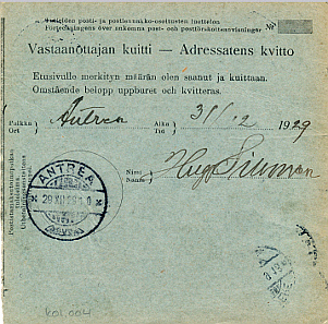 K01.004. 12.1929 Tampere -> 29.12.1929 Antrea Herra Hugo Sihvonen Vuoksi (Antrea) Antrean kutomaliike |