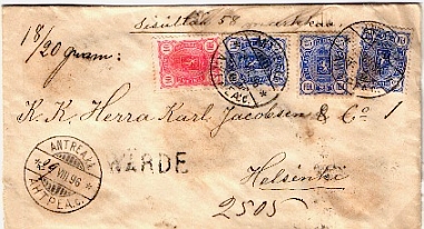 K01.011: Wärde-kuori 29.08.1896 Antrea kk -> 30.08.1896 Helsinki Herra Karl Jacobsen & Co, Helsinki |