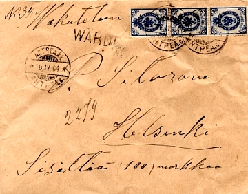 K01.012: Wärde-kuori 18.04.1904 Antrea k.k. - 19.04.1904 Helsinki Risto Juntunen, Kaskiselkä - P. Sidorov | |