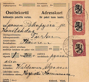 K41.022: 05.06.1925 Korpiselkä Waldemar Ahponen 06.06.1925 Turku Suomen Polkupyörä- ja Konetehdas |