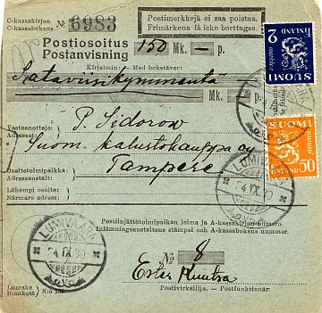 K17.015: 24.09.1930 Lumivaara 25.09.1930 Tampere P.Sidorov Suomalainen Kalustokauppa |