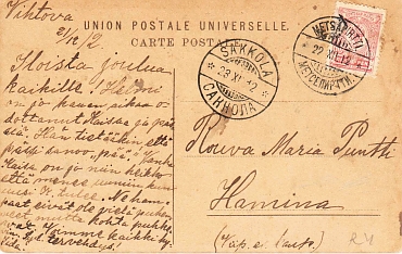K18.003: (21.12.1912 Vihtova) 23.12.1912 Metsäpirtti 23.12.1912 Sakkola Rouva Maria Puntti Hamina |