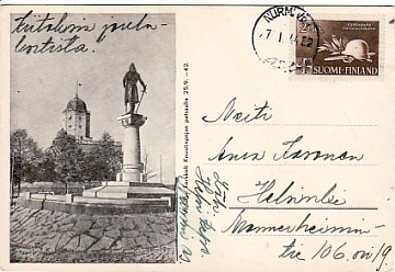| K44.016: 27.01.1944 Nurmi Vp.l. Anna Lasonen Helsinki kuva: Torkkeli Knuutinpojan patsas Viipuri (vh) | |