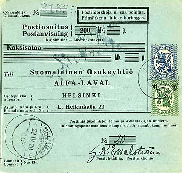 K53.020: 28.04.1928 Nuijamaa 02.05.1928 Helsinki ALFA-LAVAL (mc) |
