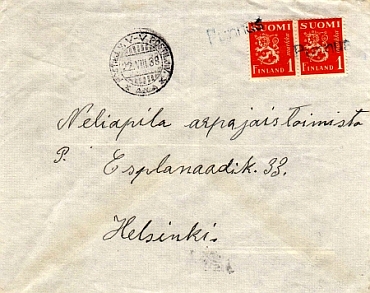 | K19.065: pp Punnus 22.08.1938 PPostilj.v V-V Neliapila arpajaistoimisto Helsinki | |