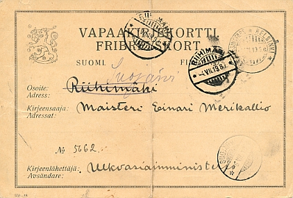 K30.055: 04.07.1919 Helsinki 06.04.1919 Suojärvi Maisteri Einari Merikallio | |
