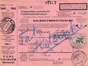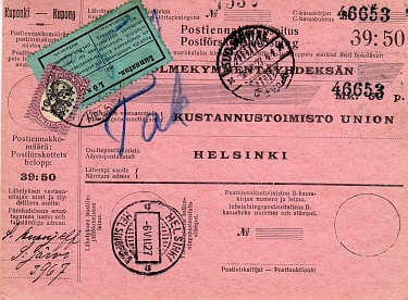 K30.057: 06.07.1927 Helsinki Kustannustoimisto Union 09.08.1927 Suojärvi As. takaisin Helsinkiin 11.08.1927 Helsinki |