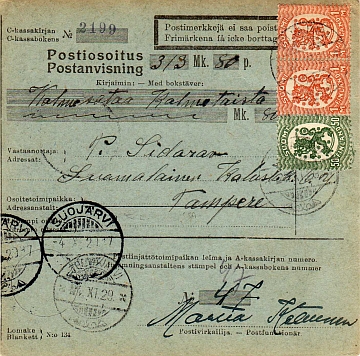 K30.058: 12.07.1927 Helsinki Helsinki 14.07.1927 Suojärvi AS. Toivo Jaatinen 16.08.1927 Suojärvi As 17.08.1927 Helsinki |