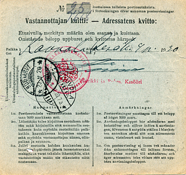 (X) Hirvikoski esittää epäilyn X olemassaolosta es; (X=tp, es=ennen sotia) Helkiö ei tiedä ajalta es löytyvän postileimapainannetta. Epäily on perusteltu. OHJ.T.37 ei tunne X, eivät myöskään PKK:t ajalta 1937-1940 Tämä toteamus kuuluu huomautuksena sellaisenaan seuraavan ryhmän tp:n kohdalla : Kahvenitsa, Pyhäjärvi Kemppilä, Jääski Kuikkaniemi, Suojärvi Pöyryniemi, Vuoksenranta Salonkylä, Suojärvi Sudenoja, Muolaa (RA) |