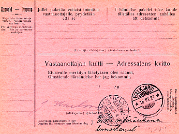 K35.013: 14.06.1927 Helsinki 16.06.1927 Walkjärvi Vintari Pekki - palautettu takaisin 20.07.1927 Walkjärvi 22.07.1927 Helsinki |