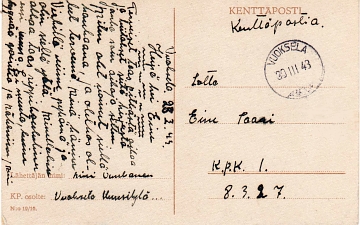 K37.007: 30.03.1943 Vuoksela Airi Vanhanen Vuoksela, Vanhakylä Lotta Eine Saari K.P.K 1 8.3.2.7 33 . KS |