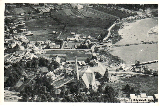 Postikortti, viivoituksella Koiviston kirkonkylää 60 m:n korkeudelta (Ilmavoimat) t. J. E. Rosbergin sarja V. 23. 6. (vh)