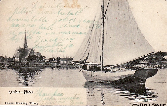 Postikortti Koivisto - Björkö ?.?.? Koivisto-Björkö 24.06.1905 Kivennapa, Lipola Neti Elin Halberg -> Venäjälle t. Conrad Oldenburg Wiborg (vh)