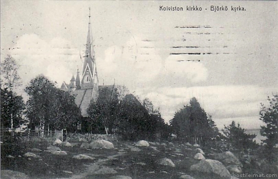 Valokuva - Postikortti Koivisto kirkko - Björkö kyrka 10.05.1910 Helsinki 11.05.1910 Kristiina Fröken Elina Holmberg t. ? (vh)