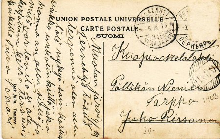 X496.01: Postikortti No.1409 Perkjärvi pp-Keskikylä ym. 03.08.1913 Perkjärvi 04.08.1913 Melalahti Juho Rissanen Pölläkän niemen torppa Kuopio, Melalahti (vh)