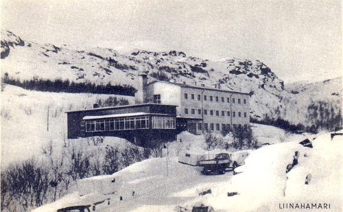 Postikortti, viivoituksella Petsamo - Liinahamari, Matkailijayhdistyksen hotelli t. SA II.75 va. A. V. Heikkinen