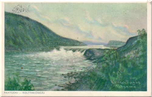 Postikortti, viivoituksella Petsamo, Paatsjoki 12.07.1938 Petsamo t. Petsamon Osuuskauppa rl kuva: O Cajan 1930 luvulla (vh)