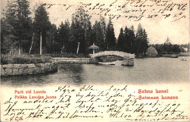Postikortti, viivoituksella Saimaan kanava, Paikka Lavolan luona, Viipurista pohjoiseen 19.08.1902 P.VAUNU H:FORS-S.T.BURG No2 21.08.1902 Mariehamn Fröken Ellen Sundahl t. ?