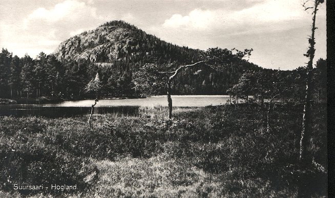 Postikortti Suursaari, Liivalahden järvi, taustalla Haukkavuori kulkematon, viivoituksin t. Suomen Matkailijayhdistys v. Leander Mattila