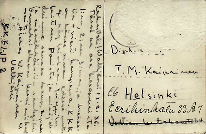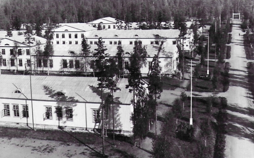 Valokuva, Postikortti Valkjärvi, kasarmit Kuvan tekstistä ; "..tässä on vain osa kasarmista 1:nen, 2:nen 3:nen . . . + viesti komppania KKK on tässä aivan edessä . . . KKK/JP2 . . . "