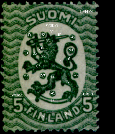 NIMITYKSET: 01 MIEKKA 011 NUPPI 012 TANKO (lyhenne nim. väistötanko) 013 TERÄ 02 KRUUNU 021-023 VASEN-, KESKI- ja OIKEA SAKARA 03 OTSA 04 KIELI 05 KÄSI 051 KÄSI 052 RANNE 053 KÄSIVARSI 054 KYYNÄRPÄÄ 055 OLKAVARSI 06 OLKAPÄÄ 07 KÄPÄLÄ 071 KESKIOSA 072 TASSU (esim. käpälän tassussa) 0721 YLÄVARVAS / YLÄVARPAAN KYNSI 0722 KESKIVARVAS / KESKIVARPAAN KYNSI 0723 ALAVARVAS / ALAVARPAAN VARPAAN KYNSI 0724 ERILLINEN VARVAS / ERILL. VARPAAN KYNSI 08 PARTA 09 HARJA 10 NISKA 11 KYLKI 12 SELKÄ (esim. selässä valk. lovi) 13 LANTIO 14 OIKEA JALKA (etummainen jalka) 15 VASEN JALKA (takimmainan jalka) .. 1 REISI .. 2 POLVI .. 3 POLVITAIVE .. 4 JALKA , (esim. vasemman jalassa alhaalla) .. 5 TASSU, (esim. vasemman jalan tassussa) .. 51-..54 VARPAAT JA KYNNET 16 HÄNTÄ 161 SILMUKKA 162 TUPSU 163 YLÄKORISTE 17 SAPELI 171 KAHVA 172 TANKO (kädensuoja) 173 TERÄ 18 RUUSUT 1.R luoteisruusu 2.R pohjoisruusu 3.R koillisruusu 4.R länsiluoteisruusu 5.R silmukan ruusu 6.R länsiruusu 7.R keskiruusu 8.R itäruusu 9.R eteläruusu NUMEROT: 1, viiri, pystyosa 2, kaarre, varsi, vaakaosa 3, ylä- ja alakaarre 4, vino-, vaaka-, pystyosa 5, viiri, kaula, kaarre 6, yläkaarre, pyöriö 7, vaakaosa, varsi 9, pyöriö, varsi 0, ylä- ja alakaarre, vasen/oikea KIRJAIMET: A, vasen- ja oikea osa, vaakaosa, sisäosa D, pystyosa, kaarre, sisäosa F, pystyosa, ylä- ja alavaakaosa I, L, pystyosa, vaakaosa M, vasen ja oikea osa, vasen ja oikea vino-osa N, vasen ja oikea osa, vino-osa O, ylä- ja alakaarre S, ylä- ja alakaarre, keskiosa U, vasen ja oikea pystyosa, alakaarre PAIKANMÄÄRITELY: kello 11,12,1 yläpuolella kello 2,3,4 oikealla puolella kello 5,6,7 alapuolella kello 8,9,10 vasemmalla puolella klo 8/9 8 ja 9 välissä AALTOVIIVAT: 1A ylimmäinen aaltoviiva 2A seuraava alempi aaltoviiva . .... 17A alimmainen aaltoviiva |