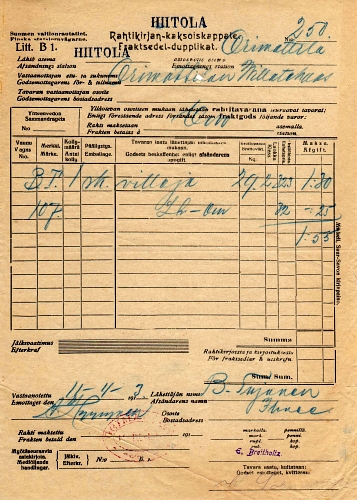 RAHTIKIRJAN KAKSOISKAPPALE, al HIITOLA 11.04.1913 HIITOLA J. Pösö Omistaja Emi Petrelius Hiitola 14.04.1913 Orimattila Orimattilan Villatehdas |