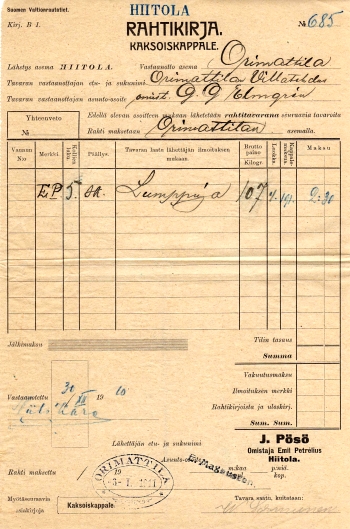 al HIITOLA 30.12.1910 HIITOLA J. Pösö Omistaja Emi Petrelius Hiitola 03.01.1911 Orimattila Orimattilan Villatehdas |