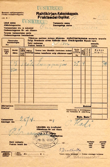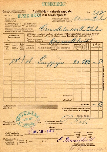 KAKSOISKAPPALE 14.12.1911 al UUSIKIRKKO 18.12.1911 Orimattila Orimattilan Villatehdas |