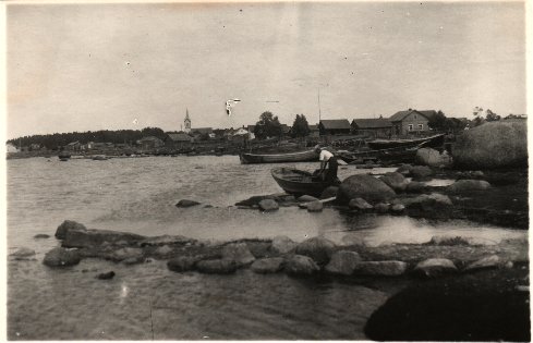 SA052a: Seiskari. Välikylän rantaa, taustalla Kiilin rantaa teksti: "Seiskarin Välikylän rantaa Pohjoisväylään päin. Oikealla Eljas Kiilin talo" k. Kaarlon Valokuvaamo, Koivisto