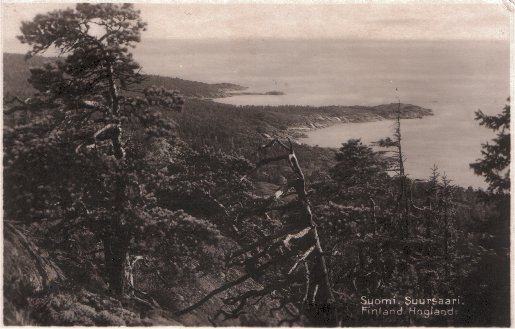 Postikortti Suursaari, länsirannikkoa (20.07.1929 Kummunjoki) pp Kummunjoki (He1, pysäkkileima 29mm, ?, sin, R5) 20.07.1929 P.VAUNU 14 (Viipuri-Nurmes 01.07.19-31.12.29) Fru Maija Räihä, Sjundeå k. Rautatiekirjakauppa Oy