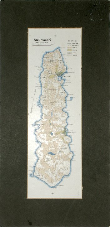 Suursaari Karttakortti leikkaamaton aihio, joka on harmaassa pahvikehyksisessä taulussa. Taulujen lukumäärästä tms. ei havaintoa. Taulun koko n. 400 x 195 mm.