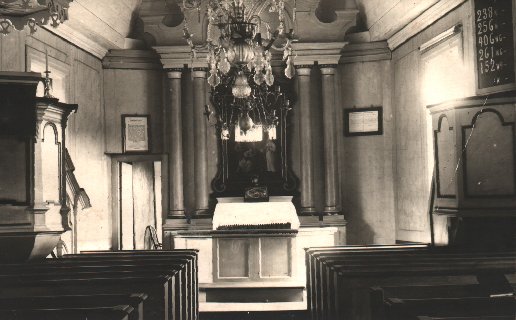 "Kirkko sisältä. Vasemmalla saarnastuoli, oikealla lukkarinpönttö"