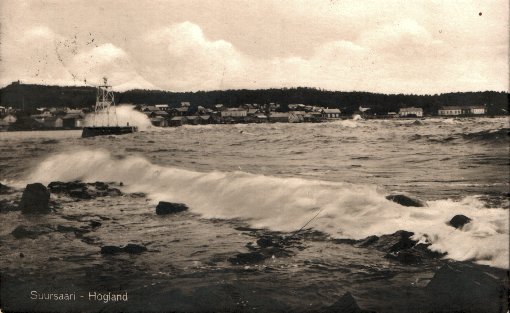 Postikortti Hogland - Suursaari. Suursaaren majakka Niemenkalliolta (Kappelniemi) nähtynä. Vasemmalla horisontissa näkyy Pohjoiskorkia majakka, torni 01.07.1927 Suursaari Rouva Alma Backman Helsinki k. Suomen Matkailijayhdistys
