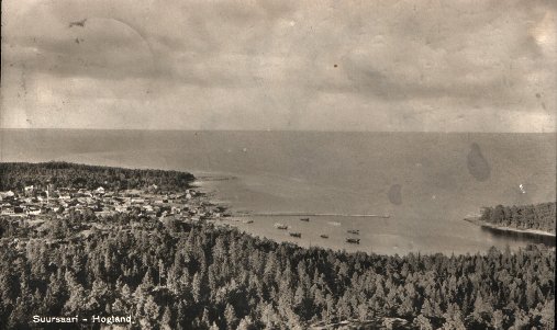 Postikortti Suursaari. Suurkylä ja Satamalahti Hevosenselänsyrjältä (Kotokallio) (16.07.1932 Suursarella) 17.07.1932 Suursaari Rouva Elvi Perttunen Nurmi k. Suomen Matkailijayhdistys