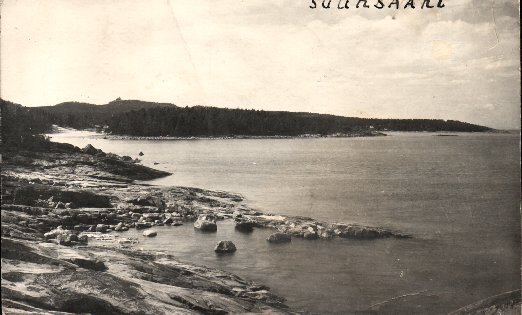 Postikortti Suursaari Kuva Lipeäniemenkuveelta katsottuna Kappellahden uimaranta ja horisontissa näkyy Pohjoiskorkean tornit 26.07.1921 Suursaari 27.07.1921 Kotka 27.07.1921 Porvoo Opettajatar Neiti Lyydi Vehniäinen k. ?
