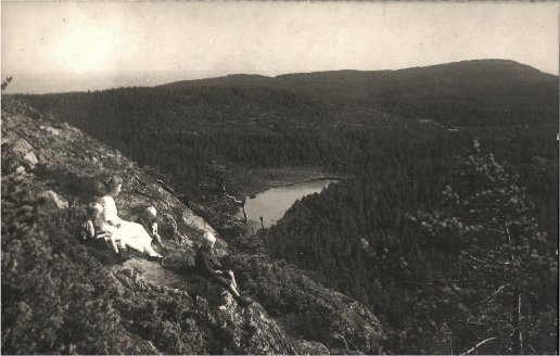 Valokuva Suursaari - Hogland Haukkavuori ja sen eteläpuolella sijaitseva Liivalahdenjärvi - perhe retkellä Haukkavuoren rinteellä ? k. ?