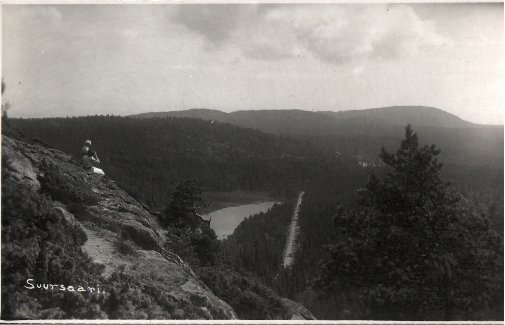 Postikortti Suursaari - Hogland Haukkavuori ja sen eteläpuolella sijaitseva Liivalahdenjärvi - retkellä Haukkavuoren rinteellä ? k. G. Salonen Sähkövalokuvaamo Kotka