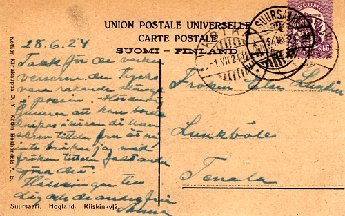 Suursaari - Hogland - Kiiskinkylä 01.07.1924 Kotka 02.07.1924 Suursaari Elsa Lunden Lunkböle, Tenala ? t. Kotkan Kirjakauppa Oy |