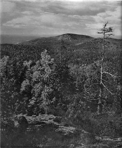 "NÄKÖALA LOUNATKORKIALTA. TAUSTALLA HAUKKAVUORI"